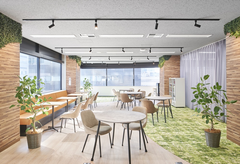 - 広い窓を活かした、カフェ風デザインのリフレッシュ兼ミーティングスペース事例