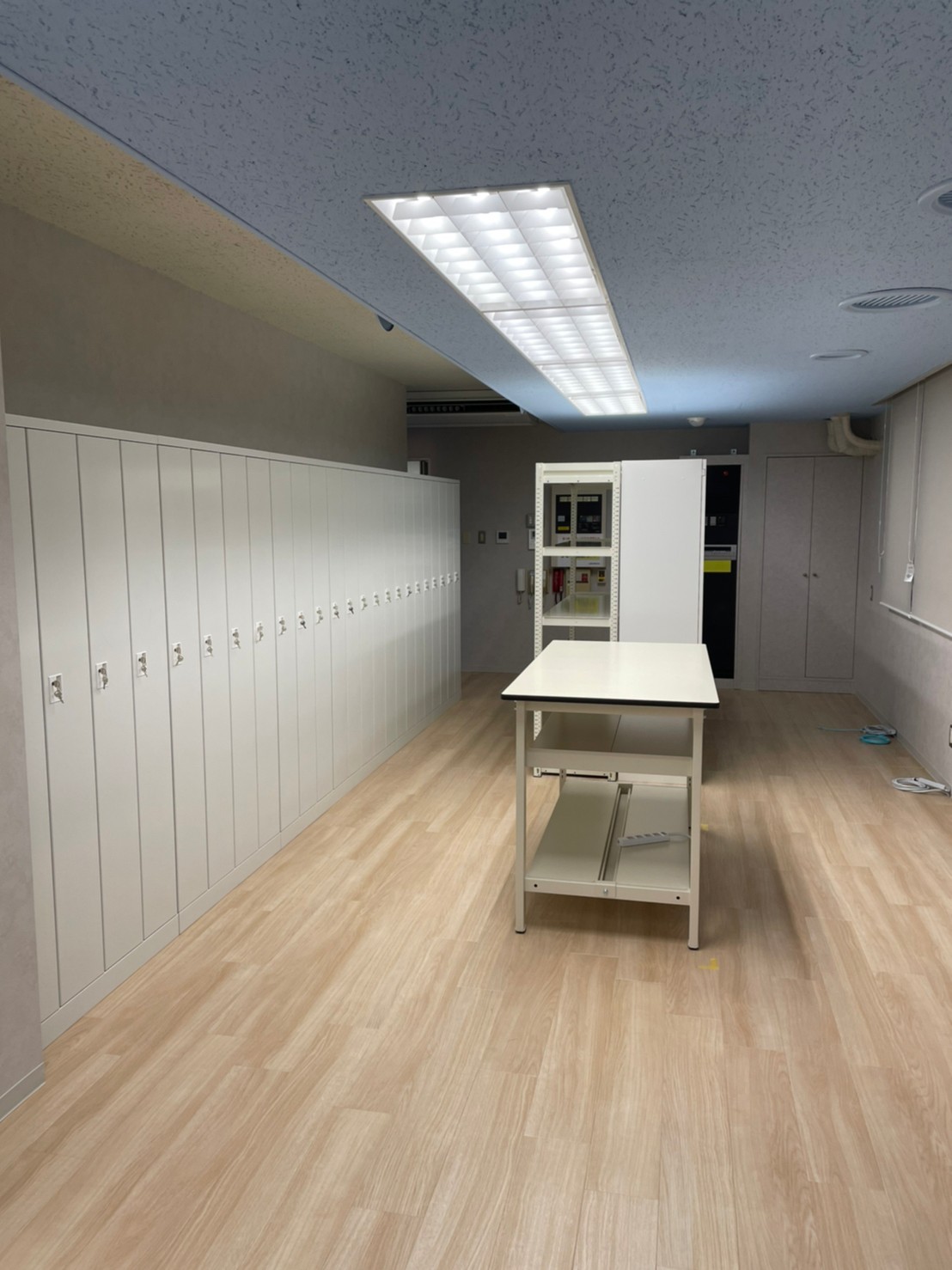 今回リフォームしたのは、製品の受注・梱包・発送業務などを行う部門も含まれているということで、オフィスフロア内には、業務スペースの他に作業スペースや書類・資料等を保管するためのロッカー・収納棚が多数設置されています。