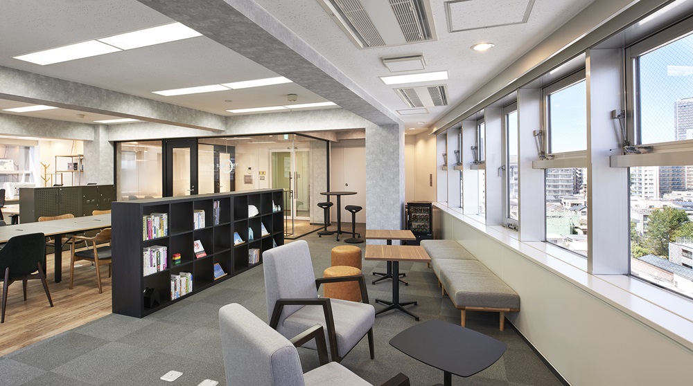 個人ロッカーと本棚でゆるりと仕切られたオフィスの多目的空間