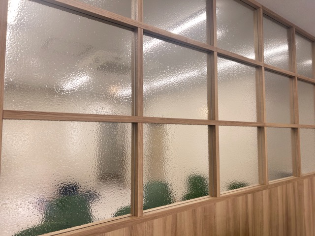 間仕切りにガラスフィルムを貼って、中がぼやけて見えるように工夫
